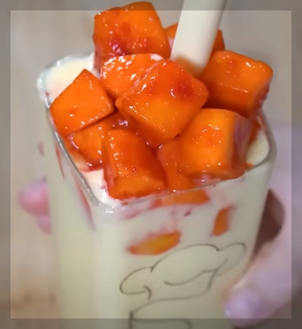 빨대를 꽂아 한입 마시고, 망고 토핑까지 먹어주면!